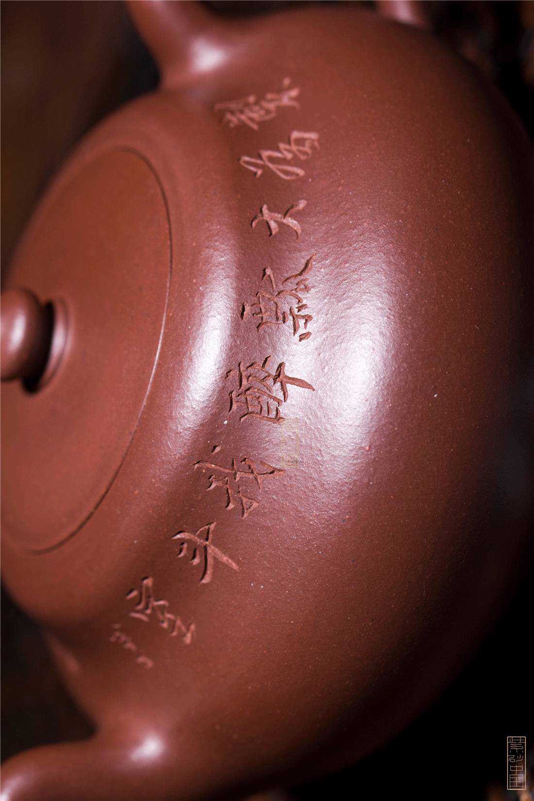 此壶形扁而意丰,造型圆润又可见刚,线条似骨,气度不凡。把圆蓄劲,暗接弯流,嵌盖与口唇合体,整体做工精细,韵味悠长。
