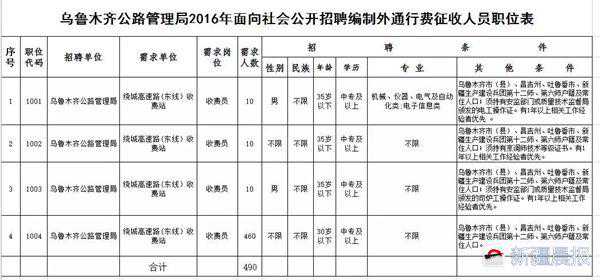 新疆晨报讯(记者马蓓)近日,乌鲁木齐公路管理局发出公告,对绕城高速公路(东线)10个收费站面向乌昌地区和吐鲁番市公开进行招聘编制外车辆通行费征收人员490名。报名时间2017年1月3日至1月10日。