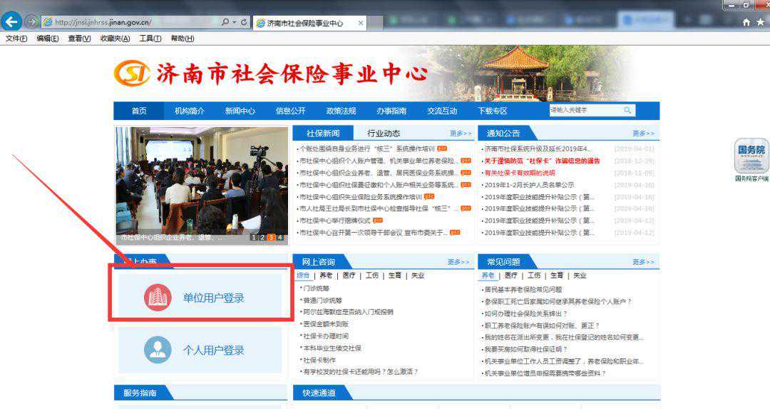 ①通过济南市社会保险事业中心网站()的超链接登录,如下图所示: