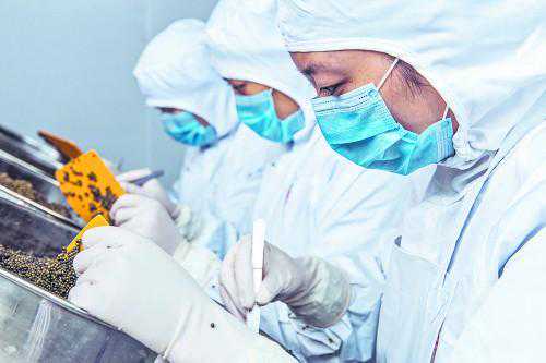 工作人员精心挑选鱼子,确保每一粒都合格