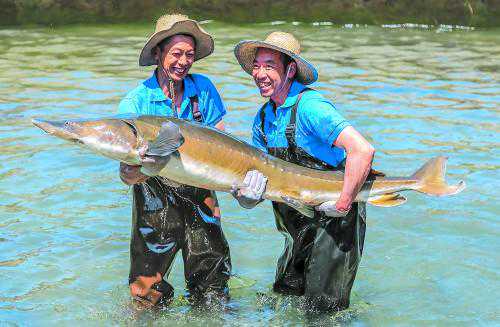 四川润兆渔业公司天全基地工作人员抱起硕大的鲟鱼