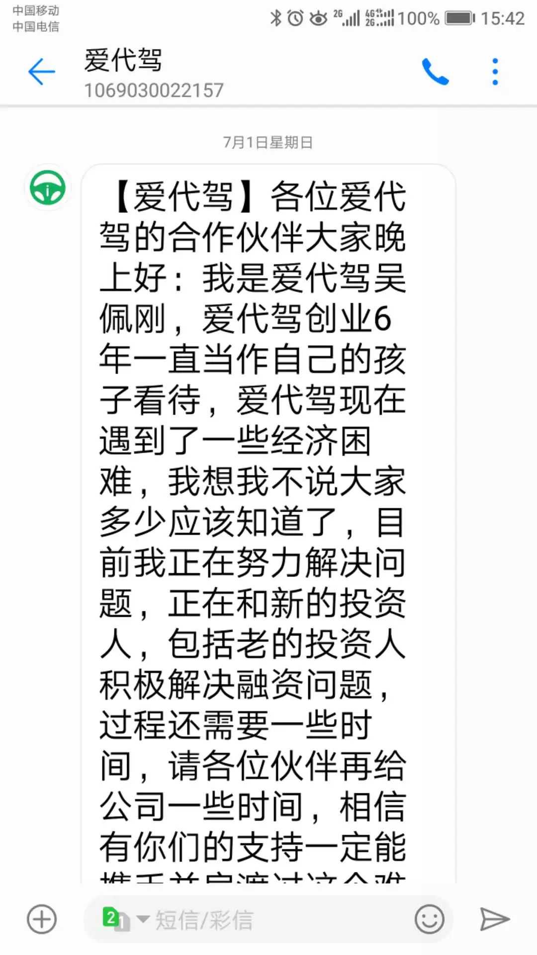 为什么退钱这么难?林先生百思不得其解。7月1日,林先生突然收到这样一条爱代驾短信,才明白其中原因。短信写到爱代驾资金困难,正在融资。