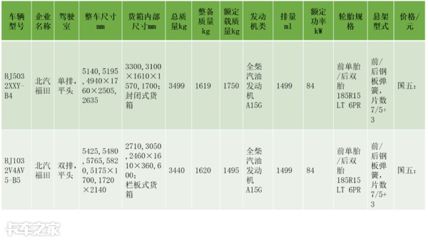 1)北汽福田BJ5032XXY-B4、BJ1032V4AV5-B5、BJ1030V5JL3-D5、BJ1032V4JV3-B4