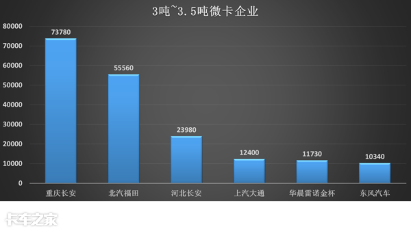 而北汽福田销量在5.5万多辆,比长安少了一半销量,在微卡界,长安的实力不容小觑。排名第四的上汽大通有12400辆,第五名为华晨雷诺金杯11730辆,第六名为东风汽车10340辆,销量是刚刚过万,与第一名和第二名差距较大,头部效应明显。