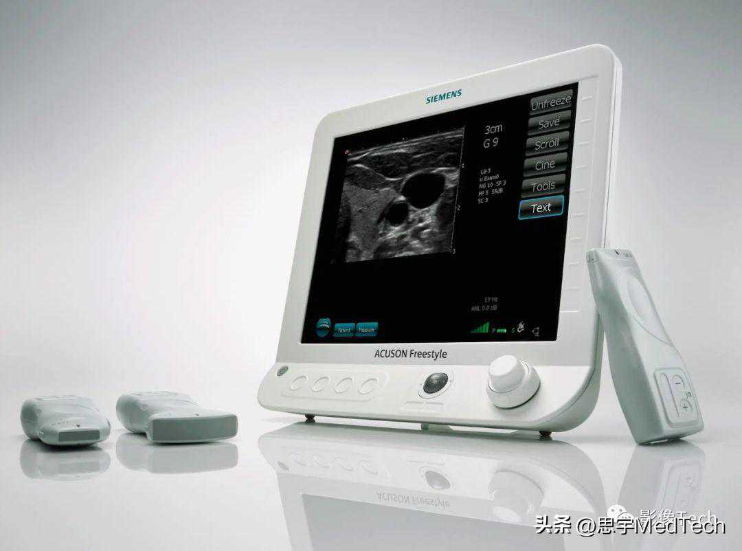西门子医疗最新的掌超产品为ACUSONFreestyle。该系统摆脱了探头和电缆线的连接,采用全新的无线技术,专为无线操作和无菌管理而设计。革新的无线探头,全密封的设计,彻底实现无菌环境。无线探头具有智能化调节装置,无菌探头上可以调节所有成像参数,无需触摸有菌的区域。
