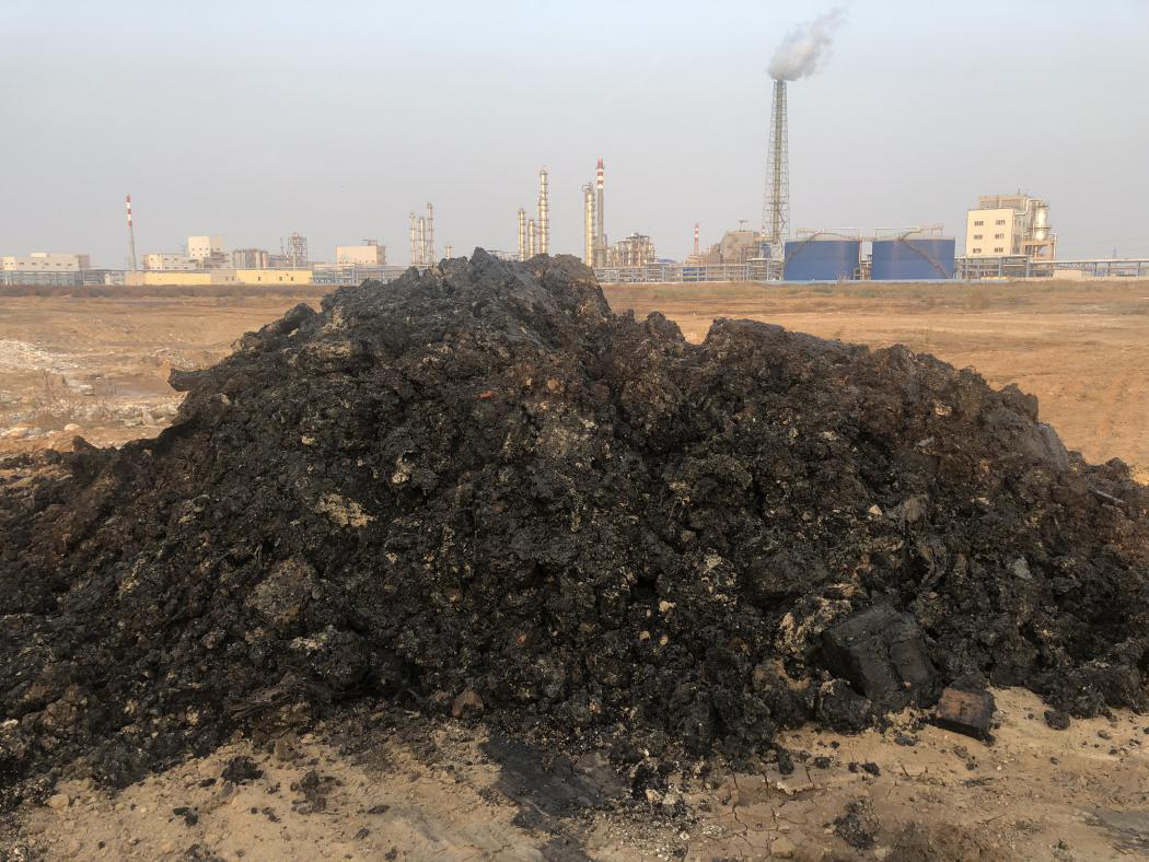 在博汇集团厂区污泥堆场下挖掘出来的黑色焦油状物质