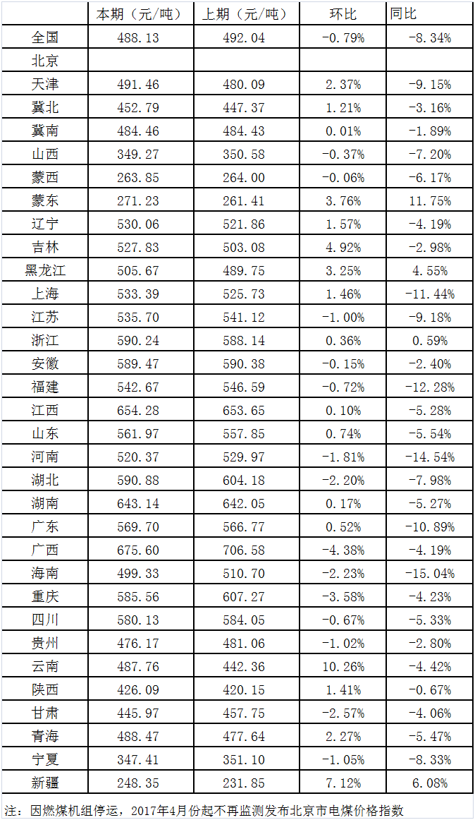 2019年8月14日,国家发展改革委价格监测中心公布7月中国电煤价格指数为488.13元/吨,环比下行0.79%,同比下降8.34%。其中,监测的31个省市(不含北京市)中,价格下行地区数量减少4个至14个,下行最大幅度收窄至30.98元/吨;其他17个地区电煤价格全部上行,涨幅上涨至45.40元/吨以内。本月煤炭价格上下行地区数量小幅变动,全国煤炭价格活动范围整体上行,反映出市场煤炭供应小幅趋紧,中国电煤指数上行动力增加。