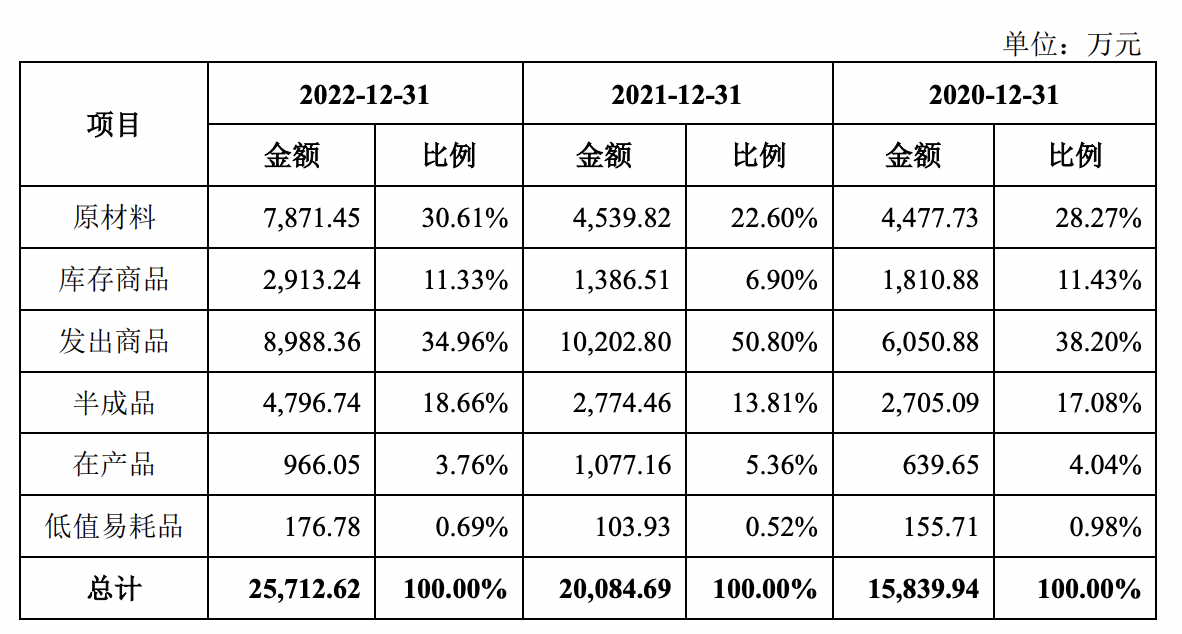 报告期内,其存货账面价值分别为1.43亿元、1.89亿元、2.5亿元,占流动资产的比例分别为26.49%、27.14%、27.47%,其中,库存商品和发出商品合计账面余额分别为7861.76万元、1.16亿元、1.19亿元,占存货余额的比例分别为49.63%、57.70%和46.29%,金额较大且占比较高。