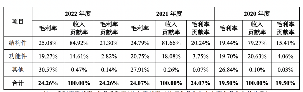 其中结构件产品毛利率对主营业务毛利率的贡献最高,贡献度分别为15.41%、20.24%、21.30%,功能件产品对主营业务毛利率的贡献度分别为4.06%、3.75%和2.82%。