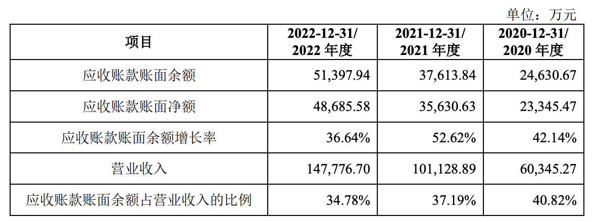 伴随着业务规模的增长,泰鸿万立的应收账款规模也相应增长,报告期内,其应收账款账面余额分别为2.46亿元、3.76亿元、5.14亿元,占营业收入的比例分别为40.82%、37.19%、34.78%。