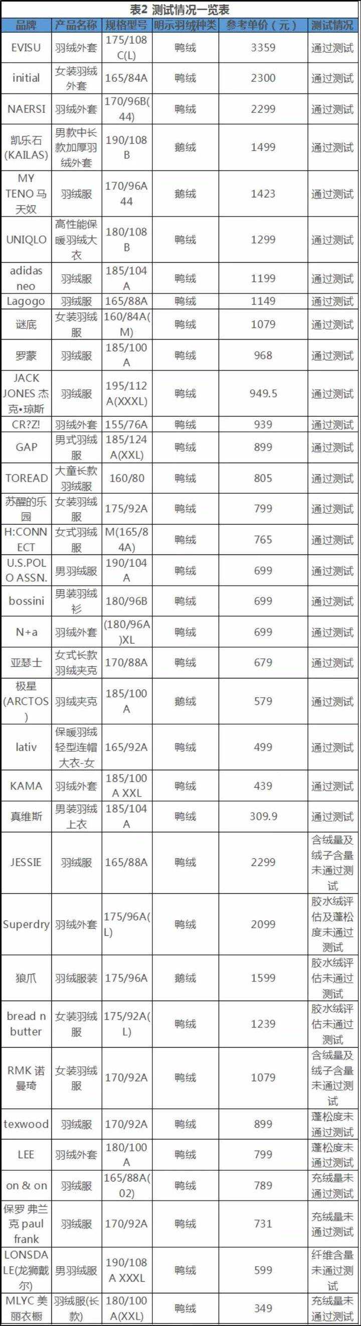 羽绒服比较试验结果