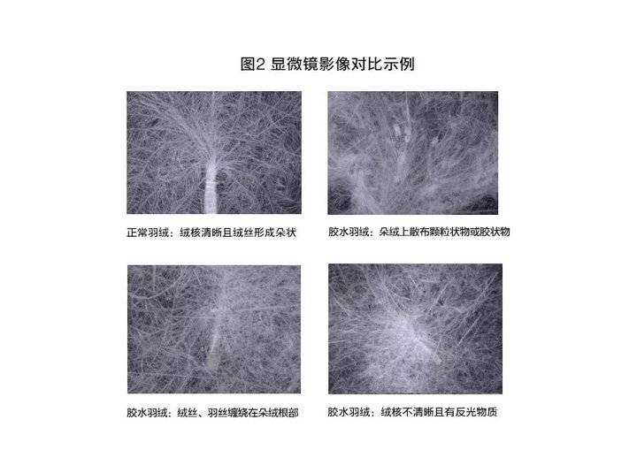 “胶水绒”是在正常的绒朵上喷上某些化学粘胶剂,将不值钱的单根绒丝及粉尘粘在或缠绕在值钱的绒上,以提高含绒量、绒子含量的检测值。“胶水绒”制品在感官上,与正常羽绒相比,往往形态较异常,羽绒分布不均匀,绒核不明显(正常羽绒和胶水绒形态对比见下图1和图2),而在化学组分上,则常发现具有显著的硅类化合物。其中胶水绒评估未通过测试有superdry、狼爪、breadnbutter。