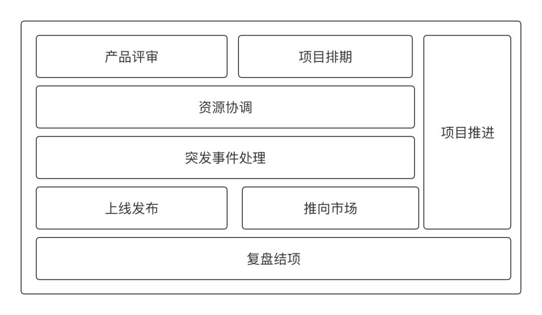 前面的工作都做完了,接下来我们要具备能够将产品推进落地的能力,那就是项目管理能力,能开会评审、能拉着技术测试要排期、可以找各方要资源、出现进度异常和突发事件时要有办法平息,比如突然插进来一个需求,要能安排上线,要能发布产品,要能聚齐大家把产品推向市场。