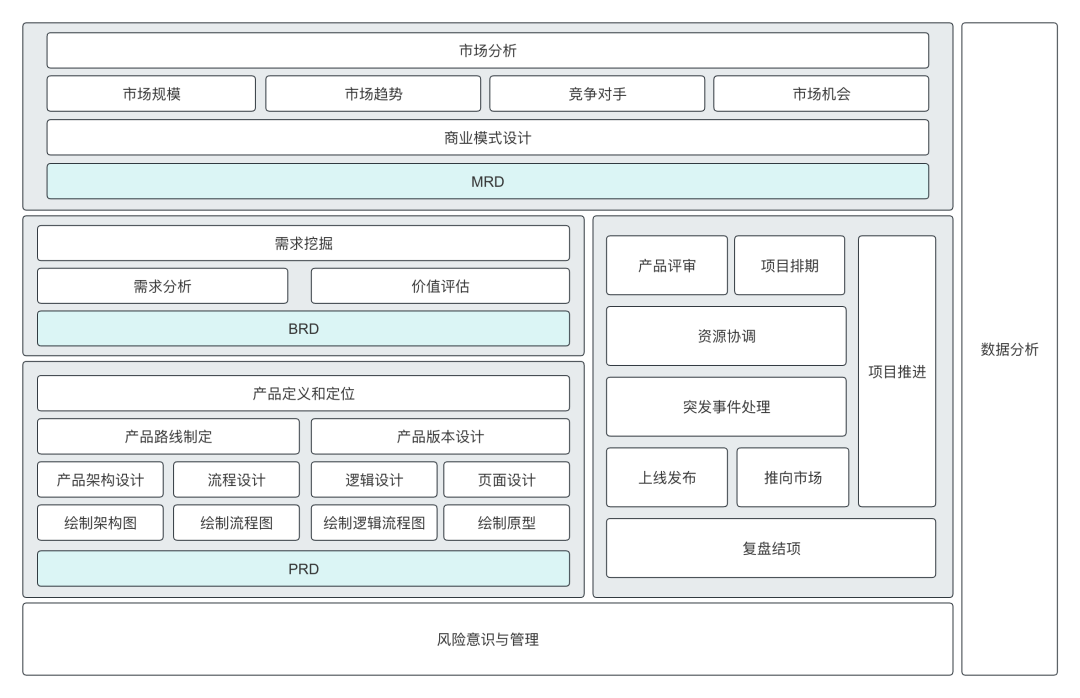 风险意识和管理,是说我们要能预知风险和处理风险;数据分析要求我们要能事前、事中、事后,通过各方和各类数据分析产品效果和运转情况,以做下一步计划,进入下一个产品周期。