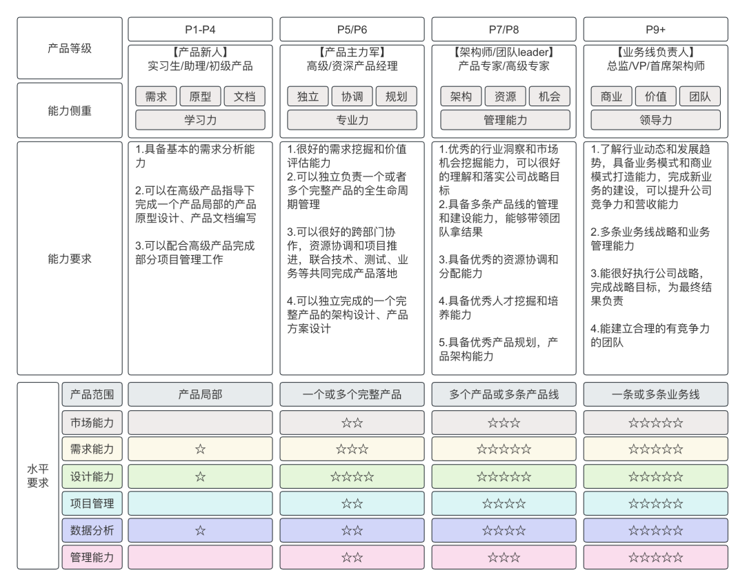 4.产品能力是分级递进的我们知道产品是分等级的,产品实习生、高级产品、产品专家、产品总监等,也有的是P5、P7、P9……