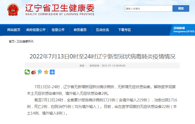 7月13日0-24时,辽宁省无新增新冠肺炎确诊病例,无新增无症状感染者。解除医学观察本土无症状感染者9例、境外输入无症状感染者2例。