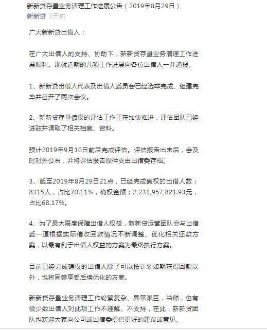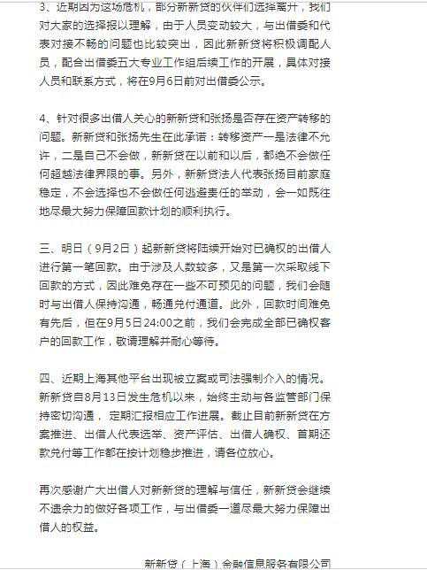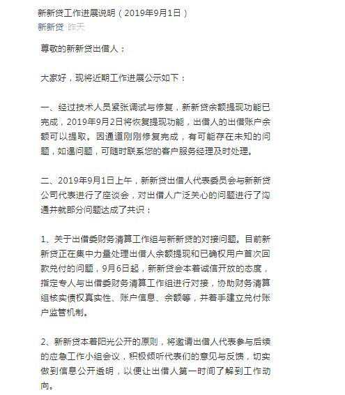 关于出借人的确权工作,新新贷9月1日工作进展说明中称,9月2日起新新贷将陆续开始对已确权的出借人进行第一笔回款。由于涉及人数较多,又是第一次采取线下回款的方式,因此难免存在一些不可预见的问题,新新贷会随时与出借人保持沟通。但在9月5日24:00之前,新新贷会完成全部已确权客户的回款工作。