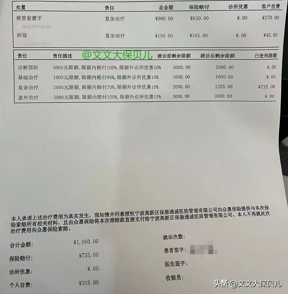 第一次就诊,客户小哥哥的根管治疗一共花了1050元,保险赔付70%就是735元,小哥哥自己自费了315元。