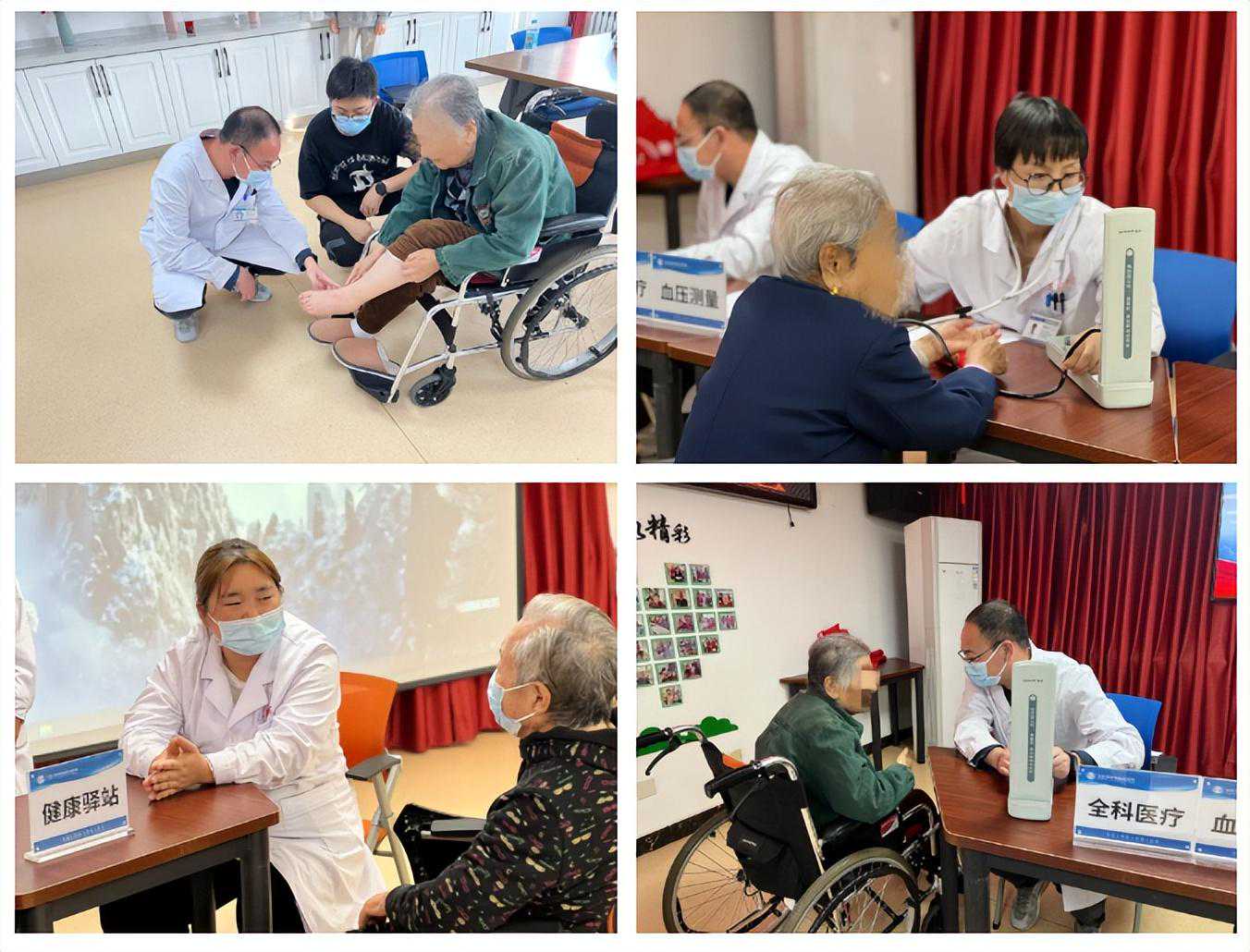 讲座结束后,健康驿站的医生们为现场老人进行了中医诊疗、测量血压等医疗服务,获得了老人的高度赞扬。一位行动不便的老人握着师大夫的手,激动地说:“感谢你,让我们就近享受到了中医和理疗服务”。