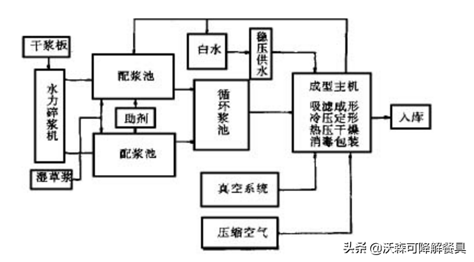 生产线是由两台真空模塑成形主机系统和与主机规模相适应的辅助系统所组成,其生产工艺如下:原料甘蔗浆(干浆或湿浆)→制浆→配浆→输浆→成型主机(注浆、吸滤成形、热压定型、真空热干)→切边→检验→成品消毒、包装→入库。