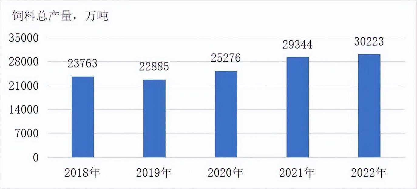 近5年,全国工业饲料产量保持增长态势,产品结构调整加快,饲料行业高质量发展取得新成效。2018—2022年全国工业饲料产量分别为23763万吨、22885万吨、25276万吨、29344万吨、30223万吨,累计增长27.2%。除2019年受非洲猪瘟疫情和国际贸易形势变化影响饲料产量下降外,近3年产量连续增长。