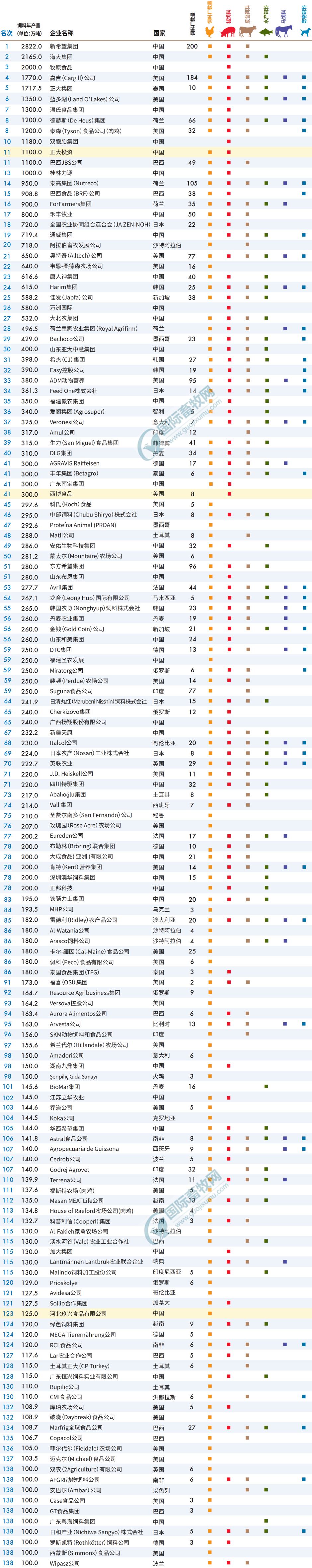 近日,WATT国际传媒发布全球顶尖饲料企业排行榜,榜单显示,2022年全球147家顶尖饲料企业饲料产量超过5.38亿吨,占全球饲料产量的43%,上榜企业饲料年产量均超过100万吨。